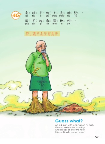 老頭 子 腳上 長 頭髮, 46 老頭子腳上長頭髮 清早起來滿地爬。 清早起來滿地爬 猜 一 種日常家庭用品 猜一種日常家庭用品 Guess what? An old man with long hair on his feet, Gets up early in the morning; And creeps all over the floor. ( Something to use at home ) 57