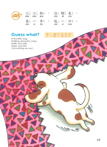 小小狗,沿階走, 48 小小狗 沿階走 走一步,咬 一 口。 走一步 咬一口 Guess what? 猜 一 種日常用品 猜一種日常用品 A tiny little dog, Walking along the steps; Walks one step, Takes one bite. ( Something we use ) 59