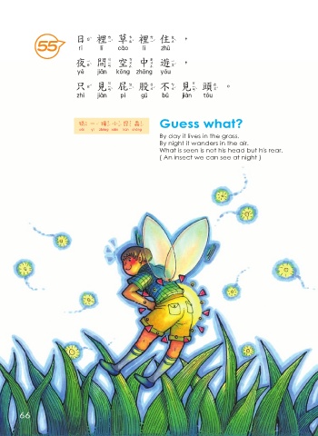 日裡草裡住, 55 日裡草裡住 夜間空中遊, 夜間空中遊 只見屁股不見頭。 只見屁股不見頭 猜 一 種小昆蟲 Guess what? 猜一種小昆蟲 By day it lives in the grass. By night it wanders in the air. What is seen is not his head but his rear. ( An insect we can see at night ) 66
