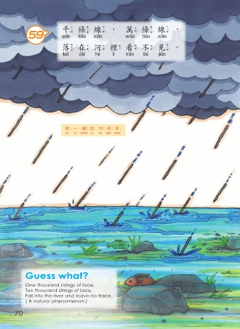 千條線,萬條線, 59 千條線 萬條線 落在河裡看不見。 落在河裡看不見 猜 一 種自然現象 猜一種自然現象 Guess what? One thousand strings of lace, Ten thousand strings of lace, Fall into the river and leave no trace. ( A natural phenomenon ) 70