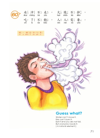 水沖 不 走,火燒不掉, 60 水沖不走 火燒不掉 吃了 不 飽,人人需要。 吃了不飽 人人需要 猜 一 種自然元素 猜一種自然元素 Guess what? Water can’t move it. Fire can’t burn it. Eat it and you are not full, But everyone needs it. ( A natural element ) 71