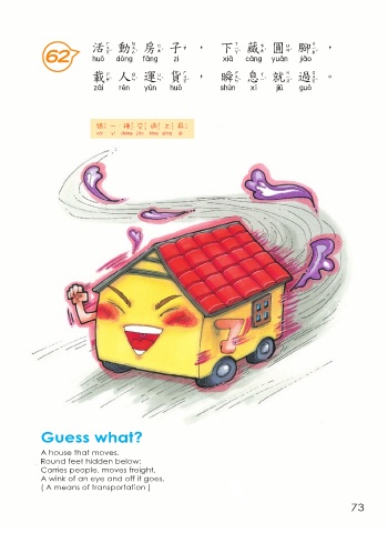 活動房 子 ,下藏圓腳, 62 活動房子 下藏圓腳 載人運貨,瞬息就過。 載人運貨 瞬息就過 猜 一 種交通工具 猜一種交通工具 Guess what? A house that moves. Round feet hidden below; Carries people, moves freight, A wink of an eye and off it goes. ( A means of transportation ) 73