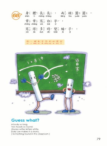 身體長長,兩頭圓圓, 68 身體長長 兩頭圓圓 常常寫白字, 常常寫白字 寫 得 多時變矮 子 。 寫得多時變矮子 猜 一 種教室常用的東 西 猜一種教室常用的東西 Guess what? A body so long, Two heads so round; Always writes letters white, Daily use makes it a shorty. ( Something found in the classroom ) 79