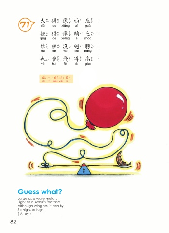 大 得 像西瓜, 71 大得像西瓜 輕 得 像鵝毛, 輕得像鵝毛 雖然沒翅膀, 雖然沒翅膀 也會飛 得 高。 也會飛得高 猜 一 種玩具 猜一種玩具 Guess what? Large as a watermelon, Light as a swan’s feather; Although wingless, it can fly, So high, so high. ( A toy ) 82