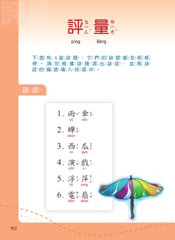 評量 評量 評 量 下面有 6 道謎題,它們的謎底都在框框 裡。請您根據謎題選出謎底,並將謎 底的編號填入括弧中。 謎底 1. 雨傘 雨傘 2. 蟬 蟬 3. 西瓜 西瓜 4. 演戲 演戲 5. 浮萍 浮萍 6. 電扇 電扇 90 90