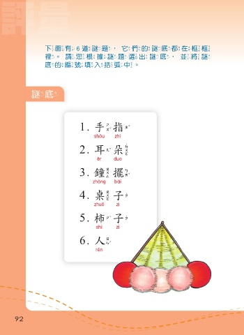 評量 下面有 6 道謎題,它們的謎底都在框框 裡。請您根據謎題選出謎底,並將謎 底的編號填入括弧中。 謎底 1. 手指 手指 2. 耳朵 耳 朵 3. 鐘擺 鐘擺 4. 桌子 桌 子 5. 柿子 柿 子 6. 人 人 92 92