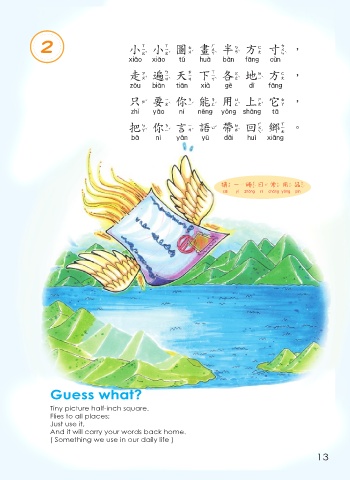 2 小小圖畫半方寸, 小小圖畫半方寸 走遍天下各地方, 走遍天下各地方 只要你能用上它, 只要你能用上它 把你言語帶回鄉。 把你言語帶回鄉 猜 一 種日常用品 猜一種日常用品 Guess what? Tiny picture half-inch square. Flies to all places; Just use it, And it will carry your words back home. ( Something we use in our daily life ) 13