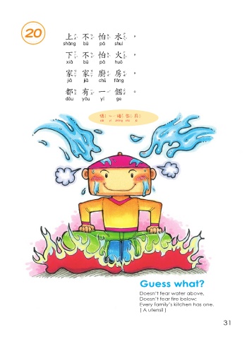 20 上不怕水, 上不怕水 下不怕火, 下不怕火 家家廚房, 家家廚房 都有一個。 都有一個 猜 一 種廚具 猜 一 種人體器官 猜一種廚具 Guess what? Doesn’t fear water above, Doesn’t fear fire below; Every family’s kitchen has one. ( A utensil ) 31