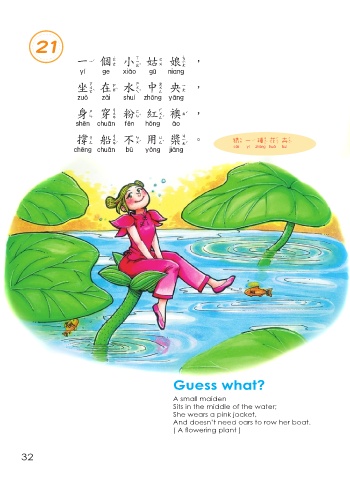 21 一個小姑 , 一個小姑 坐在水中央, 坐在水中央 身穿粉紅襖, 身穿粉紅襖 撐船不用槳。 猜 一 種花卉 撐船不用槳 猜一種花卉 Guess what? A small maiden Sits in the middle of the water; She wears a pink jacket, And doesn’t need oars to row her boat. ( A flowering plant ) 32