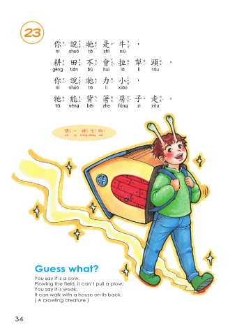 23 你說牠是牛, 你說牠是牛 耕田不會拉犁頭, 耕田不會拉犁頭 你說牠力小, 你說牠力小 牠能 背 著房 子 走。 牠能背著房子走 猜 一 種生物 猜一種生物 Guess what? You say it is a cow, Plowing the field, it can’t pull a plow; You say it is weak, It can walk with a house on its back. ( A crawling creature ) 34