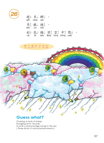 26 趕羊群, 趕羊群 吊銀條, 吊銀條 彩色橋梁空中懸。 彩色橋梁空中懸 猜三種自然現象 猜三種自然現象 Guess what? Chasing a herd of sheep, Dangling silver threads; A multi-colored bridge hangs in the sky. ( Three kinds of natural phenomena ) 37