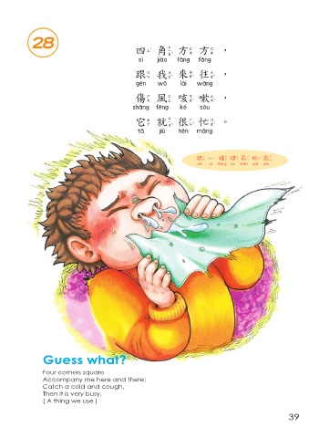 28 四角方方, 四角方方 跟我來往, 跟我來往 傷風咳嗽, 傷風咳嗽 它就很忙。 它就很忙 猜 一 種隨身物品 猜一種隨身物品 Guess what? Four corners square Accompany me here and there; Catch a cold and cough, Then it is very busy. ( A thing we use ) 39