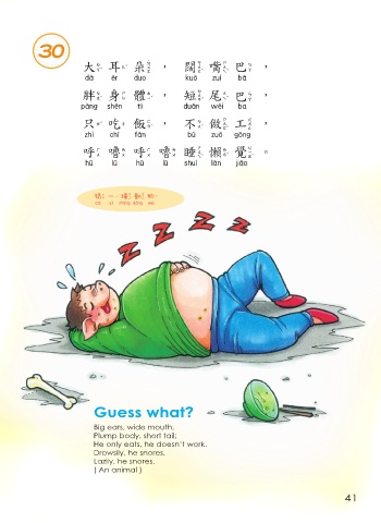 30 大耳 朵 ,闊嘴巴, 大耳朵 闊嘴巴 胖身體,短 尾 巴 , 胖身體 短尾巴 只吃飯,不做工, 只吃飯 不做工 呼嚕呼嚕睡懶 覺 。 呼嚕呼嚕睡懶覺 猜 一 種動物 猜一種動物 Guess what? Big ears, wide mouth, Plump body, short tail; He only eats, he doesn’t work. Drowsily, he snores, Lazily, he snores. ( An animal ) 41