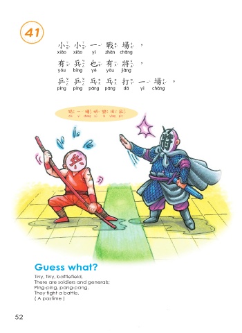 41 小小一戰場, 小小一戰場 有兵也有 將 , 有兵也有將 乒乒乓乓打 一 場。 乒乒乓乓打一場 猜 一 種娛樂用品 猜一種娛樂用品 Guess what? Tiny, tiny, battlefield, There are soldiers and generals; Ping-ping, pang-pang, They fight a battle. ( A pastime ) 52