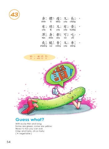 43 身體瘦又長, 身體瘦又長 有綠又有黃, 有綠又有黃 渾身都可吃, 渾身都可吃 爽脆香又香。 爽脆香又香 猜 一 種蔬菜 猜一種蔬菜 Guess what? With body thin and long, Some are green, some are yellow; Head to toe you can eat, Crisp and tasty, oh so tasty. ( A vegetable ) 54