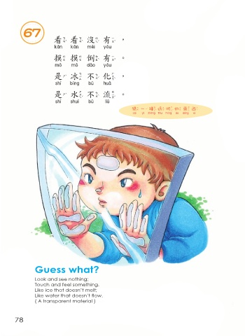 67 看看沒有, 看看沒有 摸摸 倒 有。 摸摸倒有 是冰不化, 是冰不化 是水 不 流。 是水不流 猜 一 種透明的東 西 猜一種透明的東西 Guess what? Look and see nothing; Touch and feel something. Like ice that doesn’t melt; Like water that doesn’t flow. ( A transparent material ) 78