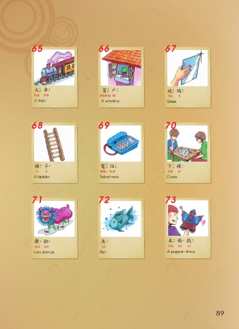 65 66 67 火 車 窗 戶 玻 璃 火車 窗戶 玻璃 A train A window Glass 68 69 70 梯 子 電 話 下 棋 梯子 電話 下棋 A ladder Telephone Chess 71 72 73 舞 獅 魚 木 偶 戲 舞獅 魚 木偶戲 Lion dance Fish A puppet show 89