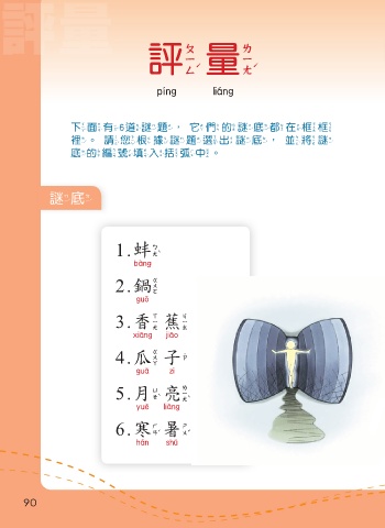 評量 評量 評 量 下面有6道謎題,它們的謎底都在框框 裡。請您根據謎題選出謎底,並將謎 底的編號填入括弧中。 謎底 1.蚌 蚌 2.鍋 鍋 3.香蕉 香蕉 4.瓜子 瓜 子 5.月亮 月亮 6.寒暑表 寒暑表 90