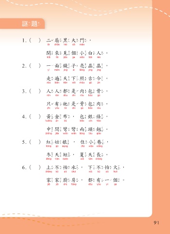 謎題 1.( )二扇黑大門, 二扇黑大門 開來見個小白人。 開來見個小白人 2.( )一面鏡子亮晶晶, 一面鏡子亮晶晶 走遍天下照古今。 走遍天下照古今 3.( )人人都是肉包骨, 人人都是肉包骨 只有牠是骨包肉。 只有牠是骨包肉 4.( )黃金布,包銀條, 黃金布 包銀條 中間彎彎兩頭翹。 中間彎彎兩頭翹 5.( )紅姑 ,住小巷, 紅姑 住小巷 冬天短,夏天長。 冬天短 夏天長 6.( )上不怕水,下不怕火, 上不怕水 下不怕火 家家廚房,都有一個。 家家廚房 都有一個 91