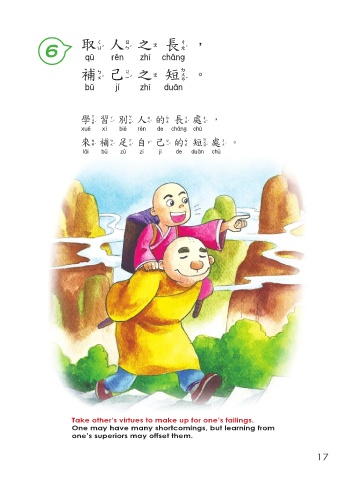 取人之長, 6 取人之長 補己之短。 補己之短 學習別人的長處, 學習別人的長處 來補足自己的短處。 來補足自己的短處 Take other’s virtues to make up for one’s failings. One may have many shortcomings, but learning from one’s superiors may offset them. 17