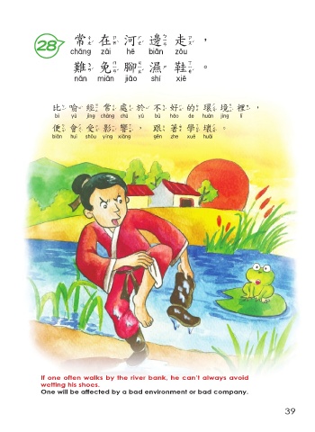 常在河邊走, 28 常在河邊走 難免腳濕鞋。 難免腳濕鞋 比喻經常 處 於 不 好的環境裡, 比喻經常處於不好的環境裡 便會受影響,跟著學壞。 便會受影響 跟著學壞 If one often walks by the river bank, he can’t always avoid wetting his shoes. One will be affected by a bad environment or bad company. 39