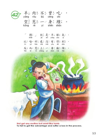 羊肉 不 曾吃, 42 羊肉不曾吃 空惹 一 身羶。 空惹一身羶 「羶」就是羊臊氣。 羶 就是羊臊氣 比喻好處沒有得到, 比喻好處沒有得到 反而惹上 一 身麻煩。 反而惹上一身麻煩 Not get any mutton but smell like lamb. To fail to get the advantage and suffer a loss in the process. 53