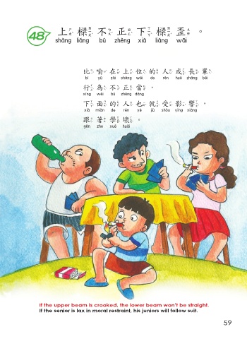上樑不正下樑歪。 48 上樑不正下樑歪 比喻在上位的人或 長 輩 比喻在上位的人或長輩 行為不正 當 , 行為不正當 下面的人也就受影響, 下面的人也就受影響 跟著學壞。 跟著學壞 If the upper beam is crooked, the lower beam won’t be straight. If the senior is lax in moral restraint, his juniors will follow suit. 59