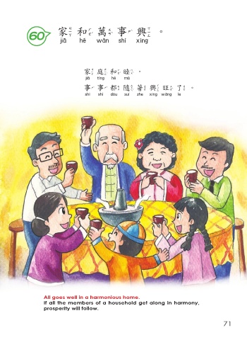 家和萬事 興 。 60 家和萬事興 家庭和睦, 家庭和睦 事事都隨著 興 旺了。 事事都隨著興旺了 All goes well in a harmonious home. If all the members of a household get along in harmony, prosperity will follow. 71