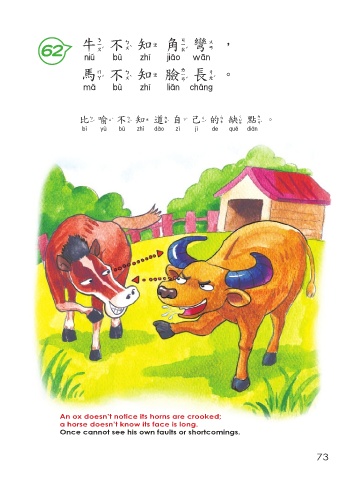 牛 不 知角彎, 62 牛不知角彎 馬 不 知臉長。 馬不知臉長 比喻 不 知道自己的缺點。 比喻不知道自己的缺點 An ox doesn’t notice its horns are crooked; a horse doesn’t know its face is long. Once cannot see his own faults or shortcomings. 73