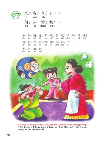 既有今日, 67 既有今日 何必當初。 何必當初 早知道會有現在這樣的結果, 早知道會有現在這樣的結果 起初就 不 該那樣做了。 起初就不該那樣做了 表示悔恨。 表示悔恨 If it had to come to this, why did there have to be a beginning. If I’d known things would turn out like this, why did I ever begin in the first place? 78
