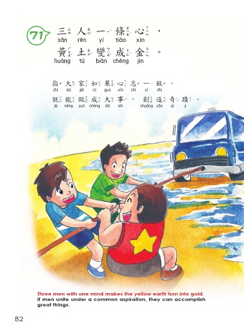 三人 一 條心, 71 三人一條心 黃土變成金。 黃土變成金 指大家如果心志一致, 指大家如果心志一致 就能做成大事,創造奇蹟。 就能做成大事 創造奇蹟 Three men with one mind makes the yellow earth turn into gold. If men unite under a common aspiration, they can accomplish great things. 82