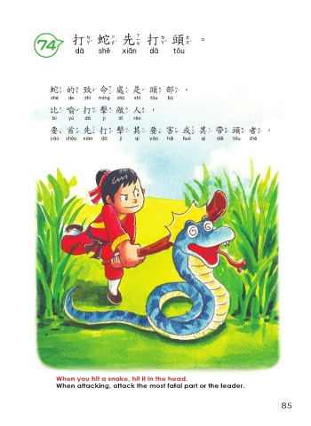 打蛇先打頭。 74 打蛇先打頭 蛇的致命處是頭部。 蛇的致命處是頭部 比喻打擊敵人, 比喻打擊敵人 要首先打擊其要害或其帶頭者。 要首先打擊其要害或其帶頭者 When you hit a snake, hit it in the head. When attacking, attack the most fatal part or the leader. 85