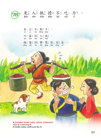 見人挑 擔不 吃力。 78 見人挑擔不吃力 自己不動手, 自己不動手 只看別人做, 只看別人做 總覺 得 事情很容易。 總覺得事情很容易 A burden looks easy when someone else is carrying it. It looks easy until you try it. 89
