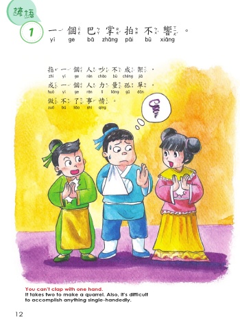 1 一個巴掌拍 不 響。 一個巴掌拍不響 指一個人吵 不 成架, 指一個人吵不成架 或一個人力量孤單, 或一個人力量孤單 做 不了 事情。 做不了事情 You can’t clap with one hand. It takes two to make a quarrel. Also, it’s difficult to accomplish anything single-handedly. 12