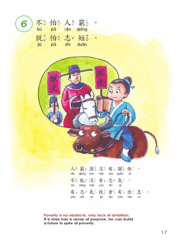 6 不怕人窮, 不怕人窮 就怕志短。 就怕志短 人窮困沒有關 係西 , 人窮困沒有關西 不 能沒有志氣。 不能沒有志氣 有志氣就會有出息。 有志氣就會有出息 Poverty is no obstacle, only lack of ambition. If a man has a sense of purpose, he can build a future in spite of poverty. 17