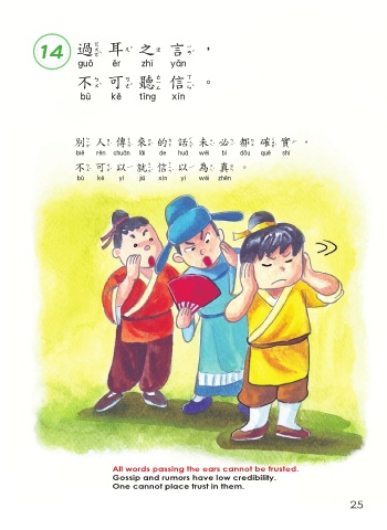 14 過耳之言, 過耳之言 不 可聽信。 不可聽信 別人傳來的話未必都確實, 別人傳來的話未必都確實 不 可以就信以為真。 不可以就信以為真 All words passing the ears cannot be trusted. Gossip and rumors have low credibility. One cannot place trust in them. 25