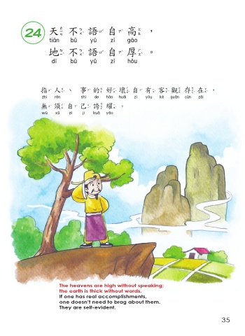 24 天 不 語自高, 天不語自高 地 不 語自厚。 地不語自厚 指人、事的好壞自有客觀存在, 指人 事的好壞自有客觀存在 無須自己誇耀。 無須自己誇耀 The heavens are high without speaking; the earth is thick without words. If one has real accomplishments, one doesn’t need to brag about them. They are self-evident. 35