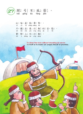27 開弓不放箭。 開弓不放箭 比喻虛張聲勢, 比喻虛張聲勢 只擺出要行動的姿態, 只擺出要行動的姿態 實際上 不 行動。 實際上不行動 To draw the bow without shooting an arrow. To bluff or to make an empty threat or promise. 38