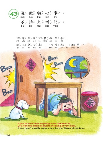 43 沒做虧心事, 沒做虧心事 不怕鬼叫門。 不怕鬼叫門 沒有做違背良心的事, 沒有做違背良心的事 就不會心虛,什麼也不用怕。 就不會心虛 什麼也不用怕 If you haven’t done anything to be ashamed of, you won’t be afraid of ghosts knocking at your door. If one hasn’t a guilty conscience, he won’t jump at shadows. 54