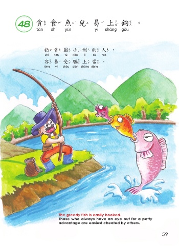 48 貪食魚 兒 易上鉤。 貪食 易上鉤 指貪圖小利的人, 指貪圖小利的人 容易受騙上 當 。 容易受騙上當 The greedy fish is easily hooked. Those who always have an eye out for a petty advantage are easiest cheated by others. 59