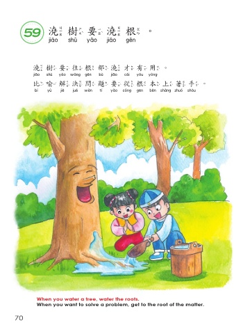 59 澆樹要澆根。 澆樹要澆根 澆樹要往根部澆才有用。 澆樹要往根部澆才有用 比喻解決問題要從根本上 著 手。 比喻解決問題要從根本上著手 When you water a tree, water the roots. When you want to solve a problem, get to the root of the matter. 70