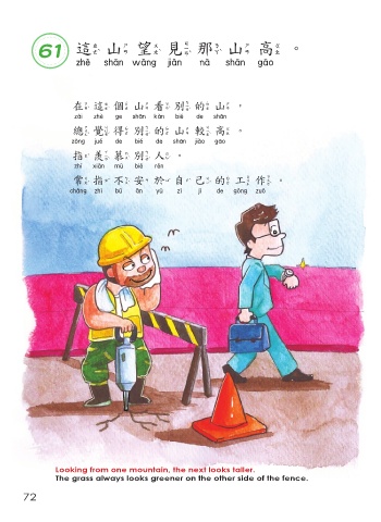 61 這山望見那山高。 這山望見那山高 在這個山看別的山, 在這個山看別的山 總覺 得 別的山較高。 總覺得別的山較高 指羨慕別人。 指羨慕別人 常指 不 安於自己的工作。 常指不安於自己的工作 Looking from one mountain, the next looks taller. The grass always looks greener on the other side of the fence. 72