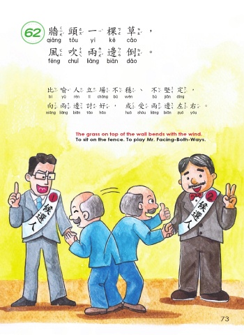 62 牆頭 一 棵草, 牆頭一棵草 風吹兩邊倒。 風吹兩邊倒 比喻人立場 不 穩、 不 堅定, 比喻人立場不穩 不堅定 向兩邊討好,或受兩邊左右。 向兩邊討好 或受兩邊左右 The grass on top of the wall bends with the wind. To sit on the fence. To play Mr. Facing-Both-Ways. 73