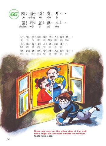 65 隔牆須有耳, 隔牆須有耳 窗外豈無人。 窗外豈無人 比喻密談須防人偷聽, 比喻密談須防人偷聽 或指背著人做的事、 或指背著人做的事 說的話總會被人知道。 說的話總會被人知道 There are ears on the other side of the wall; there might be someone outside the window. Walls have ears. 76