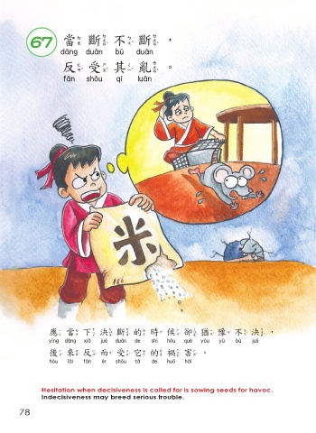 67 當斷不斷, 當斷不斷 反受其亂。 反受其亂 應當下決斷的時候卻猶豫 不 決, 應當下決斷的時候卻猶豫不決 後來反而受它的禍害。 後來反而受它的禍害 Hesitation when decisiveness is called for is sowing seeds for havoc. Indecisiveness may breed serious trouble. 78