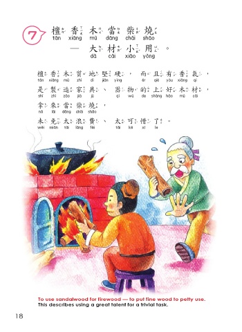 檀香木當柴燒 7 檀香木當柴燒 —大材小用。 大材小用 檀香木質地堅硬,而且有香氣, 檀香木質地堅硬 而且有香氣 是製造家具、器物的上好木材, 是製造家具 器物的上好木材 拿來當柴燒, 拿來當柴燒 未免太浪費、太可惜了。 未免太浪費 太可惜了 To use sandalwood for firewood — to put fine wood to petty use. This describes using a great talent for a trivial task. 18
