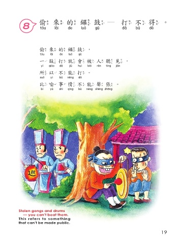 偷來的鑼鼓─打 不 得。 8 偷來的鑼鼓 打不得 偷來的鑼鼓, 偷來的鑼鼓 一 敲打就會被人聽見, 一敲打就會被人聽見 所以 不 能打。 所以不能打 比喻事情 不 能聲張。 比喻事情不能聲張 Stolen gongs and drums — you can’t beat them. This refers to something that can’t be made public. 19