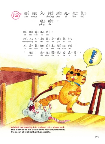 瞎貓 兒 撞到死老鼠 12 瞎 撞到死 老鼠 ─碰的。 碰的 瞎貓看不見, 瞎貓看不見 撞上死老鼠是運氣好, 撞上死老鼠是運氣好 不是靠牠的本領捉的。 不是靠牠的本領捉的 「碰」是碰運氣的意 思 。 碰 是碰運氣的意思 A blind cat running into a dead rat ─ sheer luck. This describes an accidental accomplishment, the result of luck rather than ability. 23