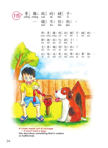 香腸做的鏈 子 15 香腸做的鏈子 ─鎖不住狗。 鎖不住狗 用香腸做的鏈 子 鏈狗, 用香腸做的鏈子鏈狗 都被狗吃掉了, 都被狗吃掉了 怎麼鎖 得 住狗? 怎麼鎖得住狗 比喻沒有效用的事物。 比喻沒有效用的事物 A chain made out of sausage ─ it won’t hold a dog. This describes something that is useless or ineffectual. 26