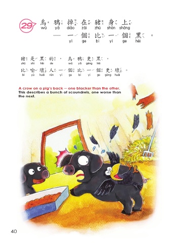 烏鴉掉在豬身上 29 烏鴉掉在豬身上 ─一個比一個黑。 一個比一個黑 豬是黑的,烏鴉 更 黑。 豬是黑的 烏鴉更黑 比喻壞人一個比一個 更 壞。 比喻壞人一個比一個更壞 A crow on a pig’s back ─ one blacker than the other. This describes a bunch of scoundrels, one worse than the next. 40